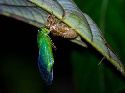 A cicada, having just emerged from its nymph exoskeleton, hangs on for life as it hardens up.
