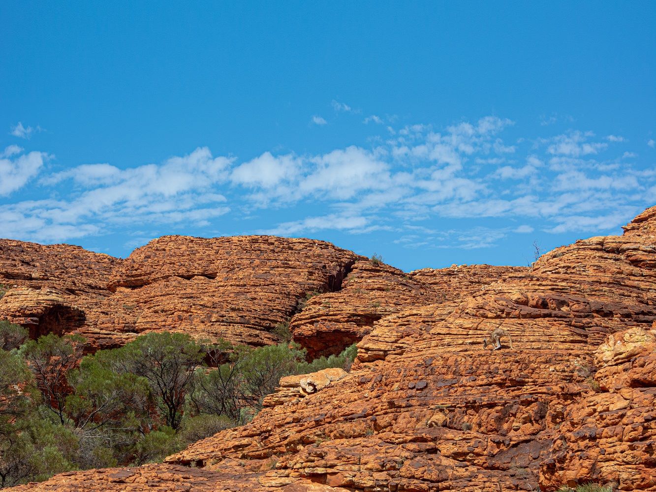 All of these species of kangaroo live in different habitats - red kangaroos are the big roamers of the desert and travel large distances across plains where some trees and shade can be found. The other species generally stick around rocky areas (especially the small rock wallabies) where they won't be eaten by dingoes. It's always extremely hot around here of course though, and the best bet for seeing them hopping around is early morning and sunrise. It's a very rewarding sight just walking through a barren landscape of minimal life and then seeing that classic kangaroo silhouette bounding across the horizon.