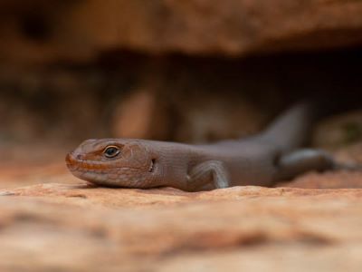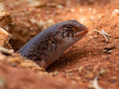 A small, very social burrowing skink that lives in colonies. They sit at the front of their holes, ready to shoot down when startled.