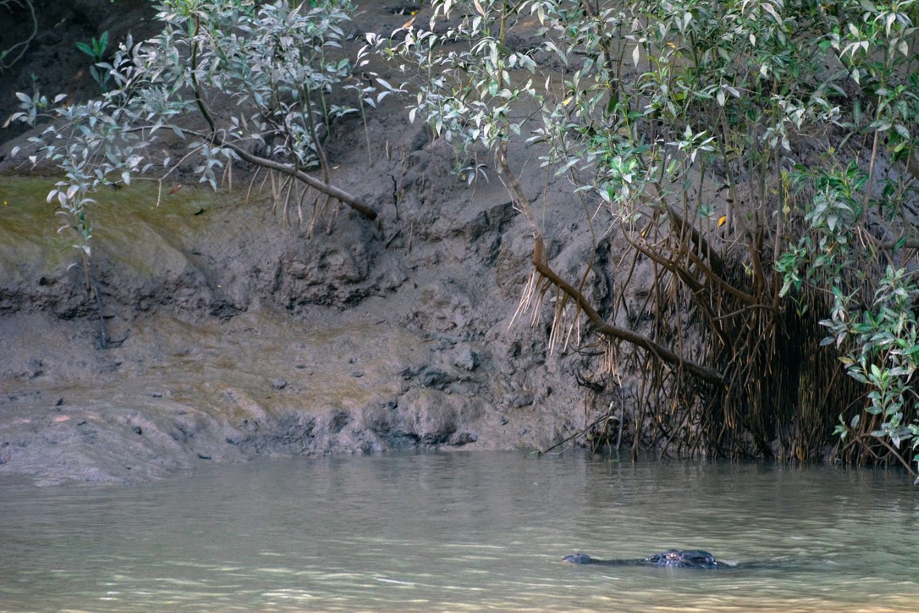 Exploring creeks can be a lot more dangerous in the tropics, with large crocodiles completely hidden in even shallow streams of water. This is a 'saltwater' crocodile, Crocodylus porosus, in freshwater (with tidal changes bringing in brackish water at high tide).