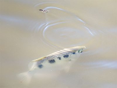 Attempted cannibalism! This archerfish just tried to eat a juvenile of its own species, which just managed to dart away. These freshwater and estuarine fish are famous for their ability to spit up jets of waters to knock down insects.