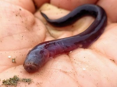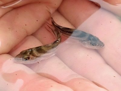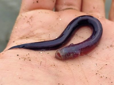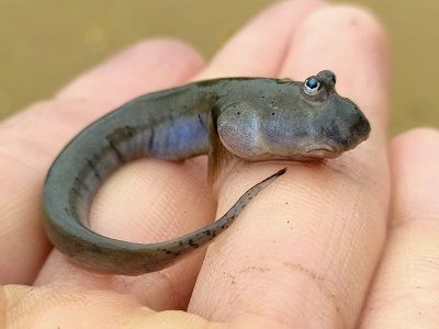 A scaleless fish, these eel-like gobies can move easily through soft substrate. This one was found in a very silty riverbed in brackish water.